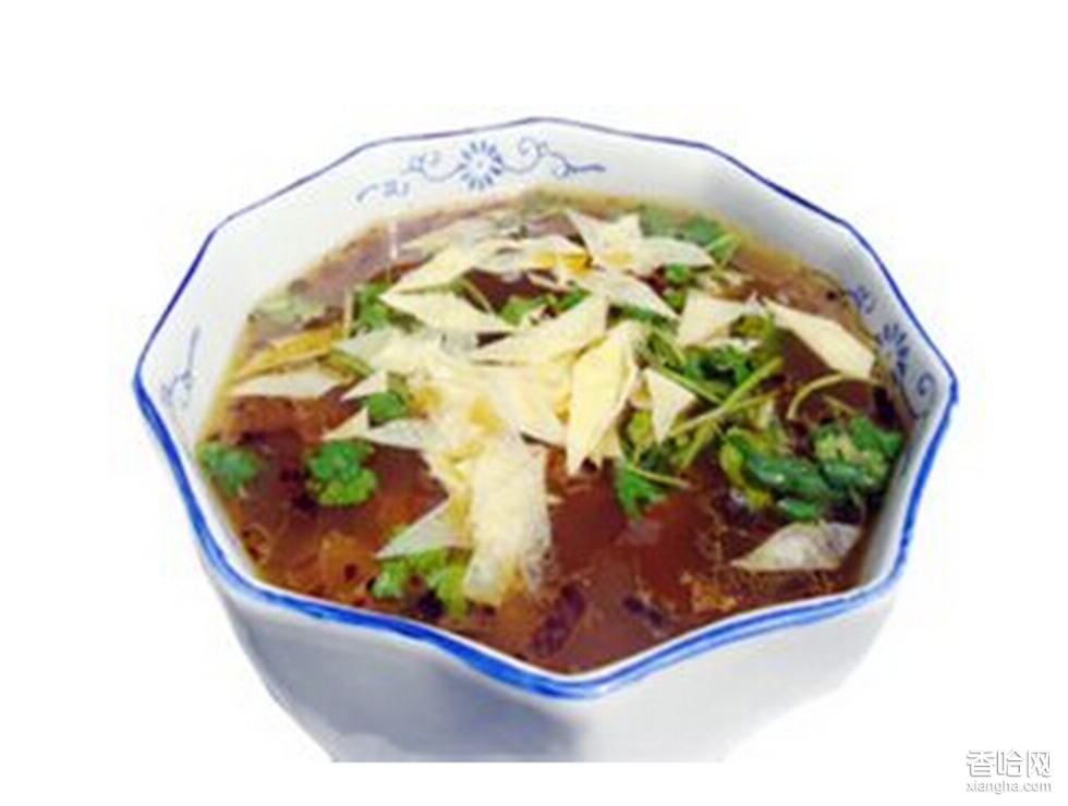 滑脊湯的做法并不復(fù)雜。將新鮮的豬瘦肉細(xì)細(xì)洗凈,切成薄片或條,用食鹽、味精碼味;然后取芡粉用開水燙成熟漿,或?qū)④头蹟嚦珊隣睢0讶馄鹌瑨靹蚝隣钴头巯氯霚佒校眯』馃跫s十五個(gè)分鐘,再放入生姜顆粒、蒜沫、蔥絲、胡椒粉等等,并用精鹽、味精、香油調(diào)好味,尤其加上老陳醋,起鍋舀出,那熱氣騰騰的碗中,盛裝登場的便是令人賞心悅目的美味的滑脊湯了。