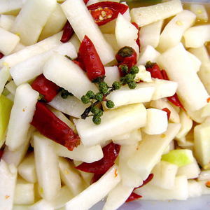 材料:白蘿卜1個(gè)、鹽適量、醋適量、白糖適量、姜適量、辣椒適量