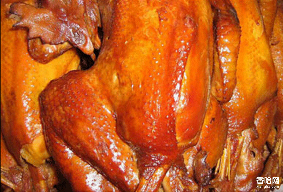 基本做法:1. 選取每只重約1500克的雞5只,宰殺,煺毛,在肛門處開一6 厘米長的小口,取出內(nèi)臟,將雞腿插入雞腹中,將雞頭盤于翅下,依次盤好5 只雞,晾一會備用;2. 將油倒入鍋中,燒到210℃左右,依次將5 只雞外皮炸成金黃色,備用;3. 取帶蓋大鍋一只,放入所有調(diào)料,倒入10 公斤清水燒開,將炸好的雞下入鍋中,用箅子將雞壓入湯中,燒煮;4. 湯沸后下入硝1克,改用文火慢煮,以使雞入味,香透入骨;5. 雞煮熟后,出鍋晾5 分鐘,趁熱抹上一層香油,冷食熱吃均可。