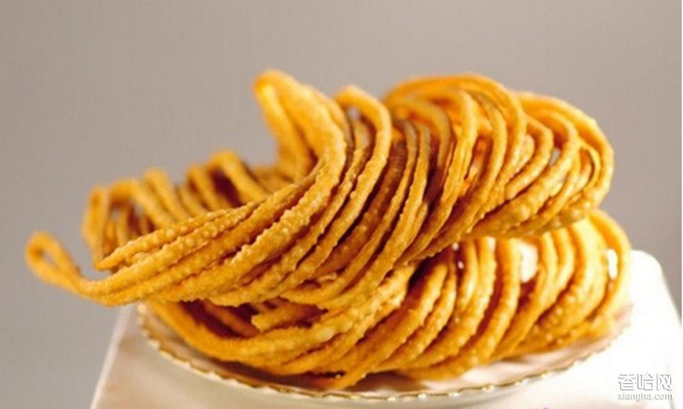 制作方法:1.制水調(diào)面團(tuán):把鹽用水充分溶解后,加入面粉拌和,然后將面團(tuán)充分搗制,一般不少于20分鐘,使面團(tuán)具有良好的韌性。不調(diào)韌性面團(tuán)制成后把它平攤在操作臺上,由邊緣逐步向中心劃開。用雙手把劃開的面團(tuán)粗條在操作臺上揉搓成5毫米直徑的細(xì)長圓條,邊揉搓邊逐層盤入放有花生油的磁盆內(nèi)(每層之間必須涂油,防止粘條),條盤放好后必須放置2小時(shí)后才可繞條炸制。2.繞條炸制:待盤條回餳后,以右手執(zhí)條邊拉邊繞排列左手四指上,繞時(shí)左手四指伸直,用大拇指按住條頭,繞7~8圈,再以右手伸入條圈中,兩手四指并攏抻拉面條,使繞條延伸至原長2倍,再騰出右手用2支筷子叉住左手上的繞條繃緊,然后雙手各執(zhí)1支筷子放入油鍋炸制,油溫一般在220℃左右。入鍋片刻用筷將繞條疊制成扇狀,再取下竹筷。也可以使1支筷子翻轉(zhuǎn)180°繞成長卷狀。還可以用不同手法制成梳型、花朵型、帚型等。油馓成型后要在油鍋內(nèi)翻動,使色澤均勻一致。待炸至金黃色出鍋瀝油。