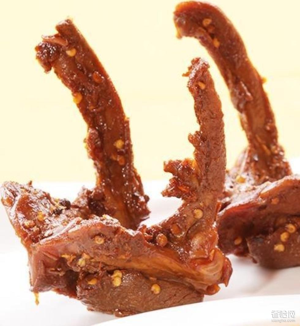 鴨脖子,又名醬鴨脖或醬鴨脖子,屬于醬汁類食品(主要是醬板鴨,包括醬鴨翅、醬鴨脖、醬鴨拐、醬鴨掌、醬鴨舌、醬牛肉、醬板魚(yú)、醬板干子、醬板藕等),最早起源流傳于清朝洞庭湖區(qū)的常德,經(jīng)湖南流傳至四川和湖北,近年來(lái)風(fēng)靡全國(guó)。醬汁類食品通過(guò)多種香料浸泡,然后經(jīng)過(guò)風(fēng)干、烤制等工序精致而成,成品色澤深紅,具有香、辣、甘、麻、咸、酥、綿等特點(diǎn),是一道佐酒佳肴。