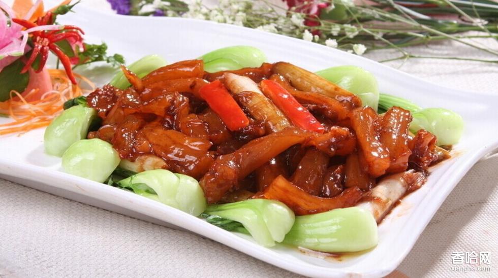 蔥燒蹄筋,典型的傳統(tǒng)魯菜,有了章丘大蔥的配料,使主料的鮮嫩軟滑揉進(jìn)了濃濃的大蔥的香甜。