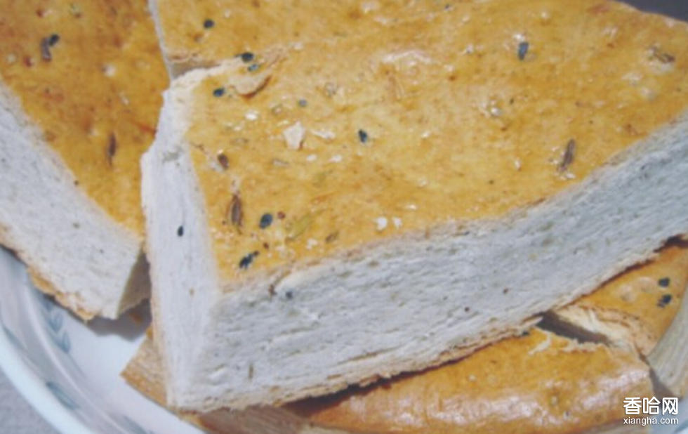 做法:1、按季節(jié)掌握水溫,先和成死面塊,放在案頭上用木杠壓,邊折邊壓,壓勻盤到,然后切成兩塊,分別加入酵面和堿水再揉壓,視面的軟硬程度,如面軟可加些干面再壓,直至面光色潤,酵面均勻時,用溫布蓋嚴盤性。2、把面塊分成每塊重約600g的面劑,推搟成直徑約22cm,厚3cm的圓形餅,上鏊勤翻轉,俗稱“三翻六轉”,烙得火均勻,皮色微鼓時即熟,周圍并有菊花形的毛邊。3、博望鍋盔用發(fā)酵面、干面反復盤揉,做成盾牌形狀上鍋炕,待兩面凝結后,把數(shù)個鍋盔疊立起來放在鍋內(nèi),不加水,用文火蒸烤至熟。烤好的鍋盔不焦不糊,具有生面的顏色、熟饃的味道。
