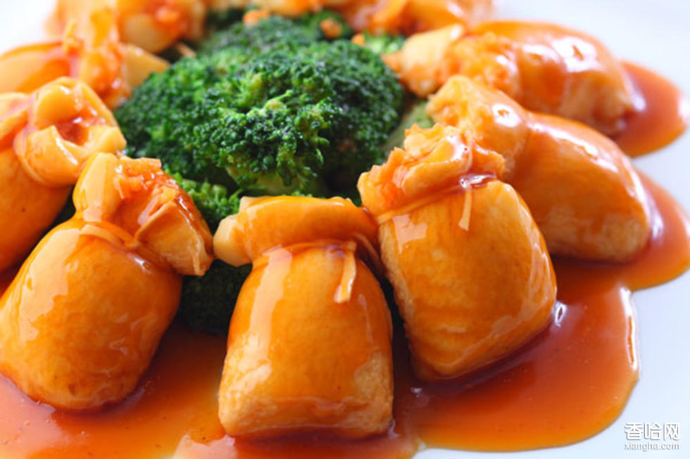 做法:玉脂豆腐炸過后鉆出空心,木耳、紅蘿卜、蝦仁、帶子切成極細的幼絲,釀入玉脂豆腐的空心中,用韭黃扎好開口處,便成了布袋狀的豆腐,入屜蒸熟,最后伴上冬菇和西蘭花,淋上鮑汁即可,配刀、叉食用。