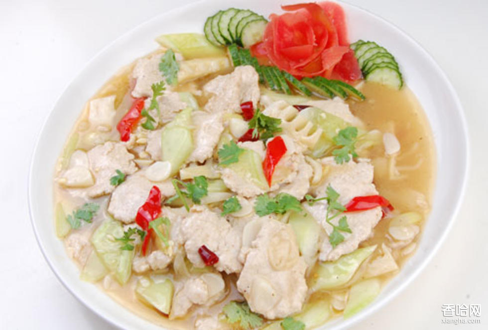 冠頂餃,漢族名菜,晶瑩透亮,油潤溢香。精面粉100克,豬肉(肥三瘦七)150克,水發(fā)干貝、水發(fā)香菇各25克,醬油10克,味精1克,胡椒粉0.5克,精鹽5克,骨清湯50克,熟火腿20克,芝麻油20克。