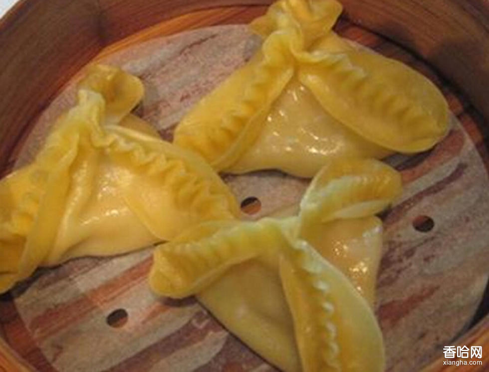 1.將干貝洗凈,去掉老筋,入籠用旺火蒸發(fā),取出后晾涼撕碎。香菇洗凈去蒂,切成末。熟火腿切成小丁。豬肉洗凈,剁成肉茸,盛入碗內(nèi),加入碎干貝、香菇末、胡椒粉、精鹽、味精、醬油、芝麻油拌勻,再加入骨清湯拌勻即成餡料。2.面粉過羅篩,放案板上,中間扒一小窩,加入溫水50克拌勻揉透,搓成細條,摘成12個劑子。逐個劑子搟成直徑約8.5厘米的薄圓皮,按三等份對折成角,將皮子翻轉(zhuǎn),光的一面朝上,中間放入肉餡15克,將三個角同時向中間捏攏,然后用食指和拇指推出花邊,將后面折起的面依然翻出,頂端留一小孔,填入火腿末,入籠蒸約10分鐘即成。