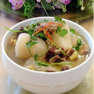 牛肉享有“肉中驕子”的美稱。具有較高的蛋白質(zhì),脂肪含量低。氨基酸的組成勝過(guò)豬肉,與人類的各種氨基酸比例較一致,能提高身體抵抗能力;同時(shí)也含有礦物質(zhì)和維生素B,牛肉還是我們身體需要的鐵質(zhì)的最佳來(lái)源哦。而白蘿卜也是一種營(yíng)養(yǎng)價(jià)值較高的蔬菜,含有豐富的維生素C和微量元素鋅、芥子油 、淀粉酶和粗纖維。本草綱目稱之為“蔬中最有利者”。所以說(shuō)兩者搭配在一起煮湯是絕對(duì)的天生一對(duì)。