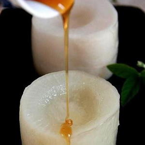 5、然后將白蘿卜拿出來,放涼后,再往每個白蘿卜里面加入蜂蜜,然后就可以吃蘿卜和里面的東西了!