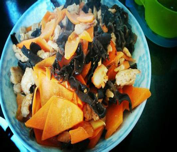 木耳胡蘿卜炒肉的主料:木耳、豬肉、黃瓜、胡蘿卜、蔥姜。