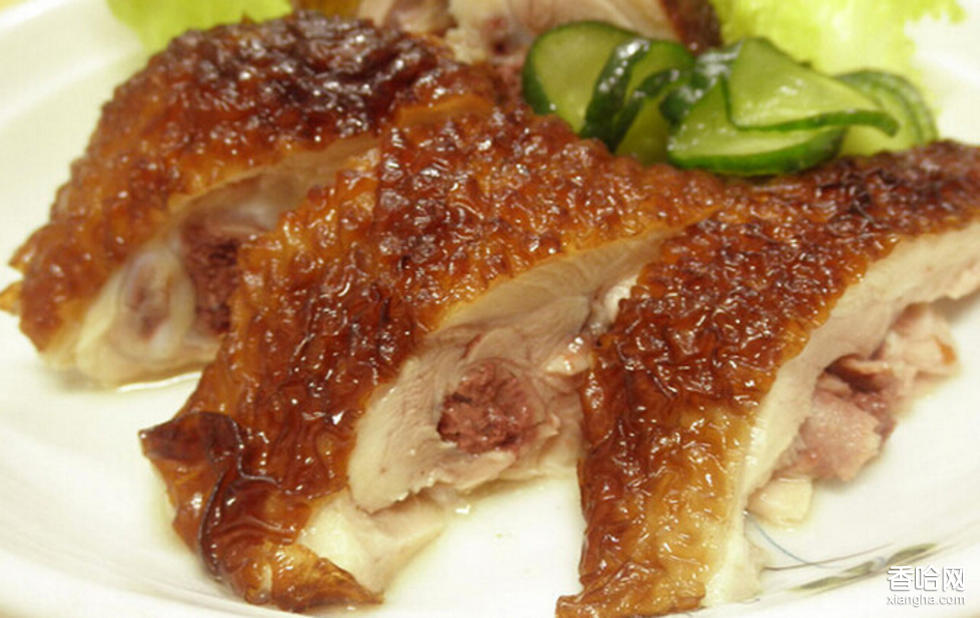 制作方法:1.將雞宰殺好,血放凈,趁雞身尚溫時,放入60~70℃的熱水內(nèi)燙5 分鐘左右,再將毛煺盡,這可使光雞潔凈白亮,色形美觀;2.然后斬去雞爪,并在雞頸上方用刀開一個小口,使食管氣管露出,又在臀部和兩腿之間各切開7~8 厘米的長口,割斷食管、氣管、掏出內(nèi)臟,切下肛門,再用清水洗凈余血和污物;3.將洗好的雞放在案板上,腹部向上,用刀將肋骨和脊椎中間處切斷,并用手按折;4.然后用小木棒一根放入肚腹內(nèi)撐起,再在雞下腹脯尖處開一小口,將兩腿交叉插入口內(nèi),兩翅交叉插入口腔內(nèi),使成為兩頭皆尖的半圓形,再晾干表面水分;5.將晾好的雞身抹遍蜂蜜水放入150℃~160℃的熱鍋內(nèi)炸成粉紅色撈出,放入另一鍋內(nèi),加上老鹵和全部香料,同時將鹽水溶化后加入,雞上壓竹箅子,使雞全部浸沒在鹵水內(nèi),隨后將硝溶化后加入,用旺火燒開;6.再改用文火繼續(xù)燜到雞熟爛為止,撈取出鍋;7.撈雞前要準(zhǔn)備好工具,撈時要手眼配合,使雞的造型達(dá)到完整美觀的要求。