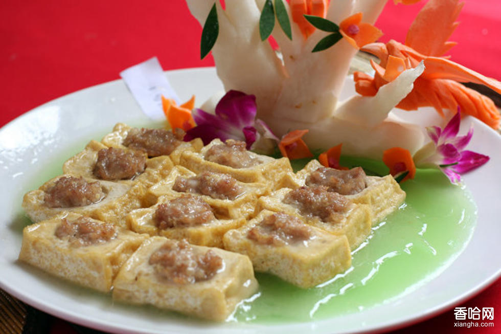它以境內(nèi)獨有的(五月黃)豆為主原料,用熟石膏調(diào)煮豆?jié){做成白豆腐。佐料要精選新鮮豬瘦肉和無筋膜的嫩牛肉,加入少許紅菇、香菇、蔥白等剁爛成鮮肉醬為餡。取團狀肉餡塞入用小指啄成窟隆的一塊塊方寸大的鮮豆腐塊中。鍋中豬油煎熱后將肉餡朝上的豆腐輕放入鍋,添入新鮮雞湯、撒少許烏豆豉,以文火微燜至熟時揭開鍋蓋,只見鍋內(nèi)豆腐微黃見白,文火中似搖似動。此時撒少許胡椒粉、小蔥花,待湯水全被豆腐吸收時起鍋,(趕滾)(即趁熱)品嘗。那白中淡黃,似搖似動的盤中豆腐謂之為漾豆腐。