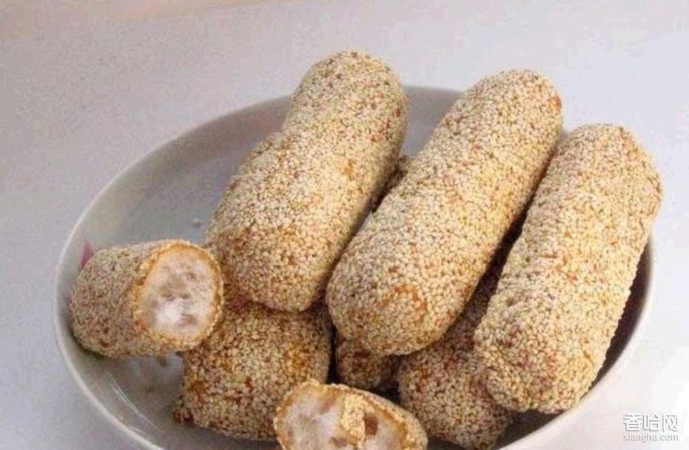 麻通用香糯粉加紅肉芋粉為主料,配入白糖,搓成小粒,置于油鍋中炸成直徑三四厘米、長(zhǎng)達(dá)10~12厘米、中間發(fā)泡而不空的小圓柱,再裹以薄糖,周身滾貼炒香的芝麻即成。因用芝麻包裹,內(nèi)如通草而得名麻通。小董麻通具有輕、香、甜、酥、脆俱全的特點(diǎn),大而不重,甜而不膩,酥脆爽口,食后余香滿口,令人回味。