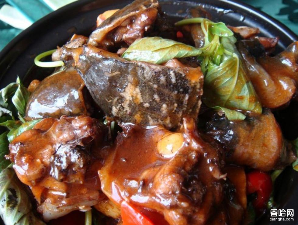 先將甲魚斬去頭,放入沸水鍋內(nèi)燙片刻撈出,用清水刮凈白膜和粘液,用刀沿魚背殼四周剖開,取出內(nèi)臟洗凈,剁成2.5厘米見方的塊。然后將腳魚盛入砂缽內(nèi),放入豬油、醬油、甜酒娘、蔥結(jié)、姜塊,加蓋用旺火燒沸后,移置小火上,燜至酥爛,然后上旺火收稠鹵汗取出蔥結(jié)、姜塊,放入味精,撒上椒粉,淋上麻油裝盤即成。特點:味香濃醇,原汁原味。