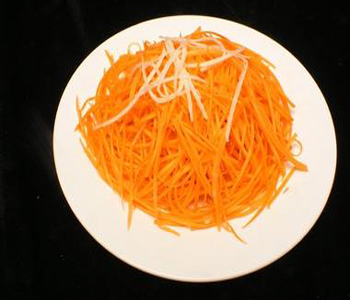 胡蘿卜炒木耳的配料:蔥段50克,花生油、姜絲、料酒、精鹽、味精各適量。
