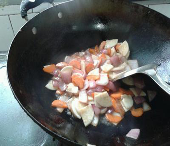 4 、洋蔥炒出香味兒,胡蘿卜入鍋炒。