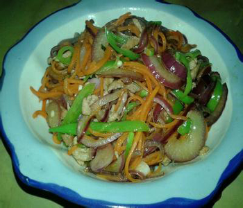 這是用洋蔥、胡蘿卜、肉片作食材素炒的一道菜。很清淡,很爽口。加之洋蔥、胡蘿卜都是蔬菜中的佳品,使得這道菜的營(yíng)養(yǎng)很豐富,還有著養(yǎng)生保健功效。肉片具有豐富的動(dòng)物蛋白,在日常生活中提供很大的熱量。