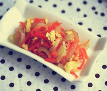 4、然后加入紅蘿卜翻炒,待紅蘿卜翻炒斷生后,即可加入洋蔥絲,待其翻炒至8成熟時,加入適量的鹽、糖及生抽,接著大火翻炒均勻即可。