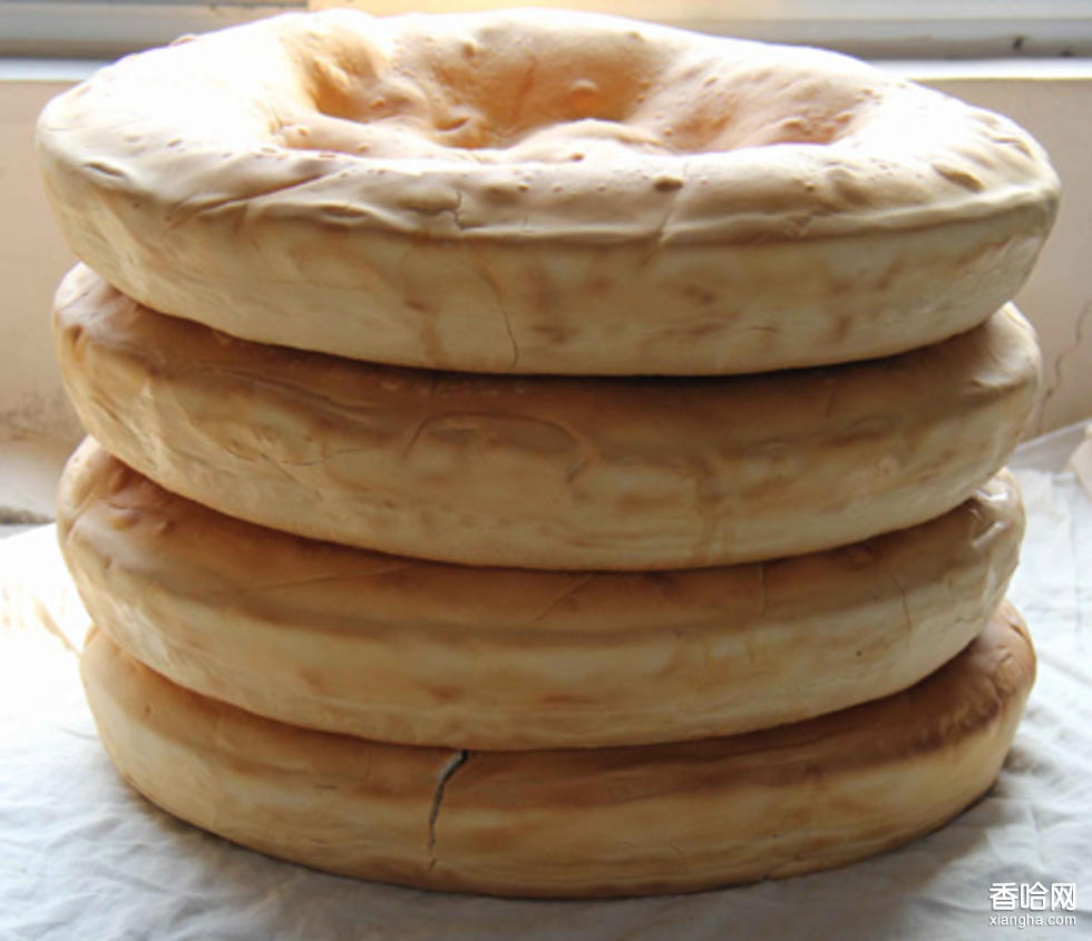 烙烤大鍋餅用料講究,工藝細(xì)致。制作時(shí)將精細(xì)的麥面用純潔的溫水和成面團(tuán),在適宜的溫度中發(fā)成“老面”(酵面),視“老面”的多少和酸味大小調(diào)以適量堿面,再加面粉、清水揉成面塊,—然后用壓杠在案板上反復(fù)擠軋,直到面塊彈性適度,柔硬適中。此時(shí),將面塊(約3公斤)用搟面杖碾成圓形,后用雙手使勁摁壓成形,直徑約50公分左右,厚2.5公分左右。雙手摁壓時(shí),手掌面背交復(fù)進(jìn)行,餅面上自然出現(xiàn)勻稱的花紋,撒上芝麻,適可而止,即可上平底鍋烘烤?;鹆?yīng)掌握“火候”始終如一,直到把大鍋餅炙出烤花均勻的熟品,出鍋上市。熟品重約2.5公斤,味香甜,有口勁,軟硬相宜,入腹后耐力強(qiáng)。