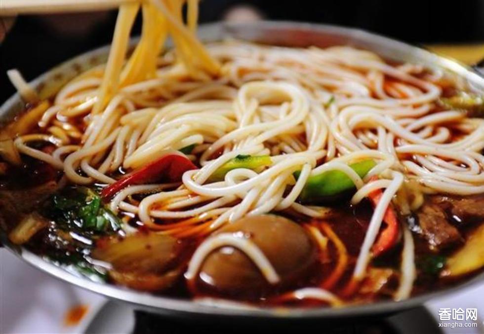 2.漏床(或壓饸饹機)放入沸水鍋上,把粉團放進漏床槽內(nèi),壓成細條落入沸水鍋中,隨落隨用竹筷挑動,待米粉條全部漂起后撈出。先用清水沖洗,再放冷水缸中冷卻即成。若將醬油、紫菜、姜汁、青蒜末少許撒放碗中,澆入高湯,隨即將米粉用沸水燙過,盛入碗內(nèi),即成高湯米粉。若將芝麻醬用涼開水調(diào)稀、放入適當?shù)木}和醋,澆在米粉上,再撒上咸香椿芽末、咸胡蘿卜末、黃瓜絲,即成麻汁米粉。在高湯米粉內(nèi)放肘子時,即是肘子米粉。