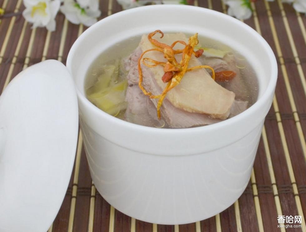 用白鴨和冬蟲(chóng)夏草燉制而成。成菜湯汁濃醇,肉質(zhì)酥爛,香而肥鮮,富有營(yíng)養(yǎng)。工藝:將白鴨宰殺,治凈,入沸水鍋中略焯取出,除去血沫,放入瓦缽或砂鍋內(nèi),加洗凈的冬蟲(chóng)夏草和澤蘭、姜塊、蔥結(jié)、紹酒、清水,燒沸后,轉(zhuǎn)用小火燉,至鴨肉酥爛,湯汁濃醇即成。
