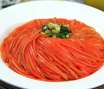 1、將胡蘿卜洗凈后切絲。不要食用切碎后水洗或久浸泡于水中的蘿卜。