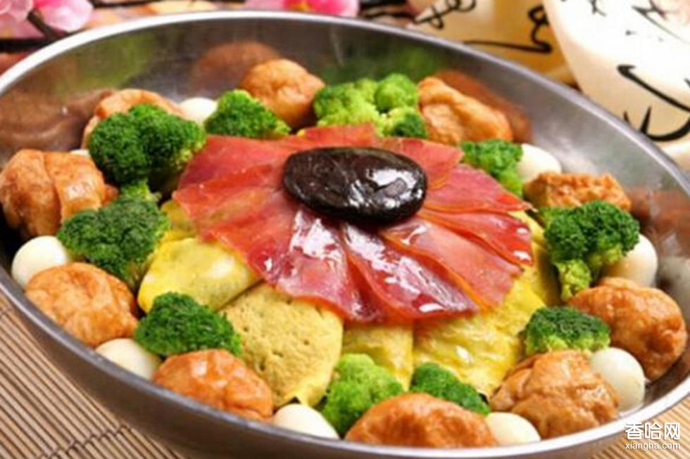 此菜色澤鮮艷,一眼望去,黃色的是蛋片;紅色的是火腿片、鮮蝦;綠色的是青菜;棕色的是牛肉片、香菇;白色的是魚片;淡白色的是雞肉片、豬肚、冬筍片,五顏六色,頗為逗人食欲。 聽老師傅介紹,做好此菜很有講究,鍋里先要放進(jìn)豬小排,加上黃酒、姜片、精鹽、調(diào)料,加水燜煮半個(gè)多小時(shí);然后,在鍋底層鋪干筍、白菜塊、豆芽菜;第二層鋪肉塊;第三層鋪油豆腐;第四層是肉圓、粉絲;更上面的熟雞肉、熟鴨片、熟牛肉片、熟火腿、熟豬肚、熟冬筍片、鴿蛋、鴨肫片、魚片等分散在四周;中間擺放鮮蝦仁、蛋餃;頂上分放鮮香菇,邊上置菠菜、金針菜點(diǎn)綴;最后注滿高湯。做時(shí),先用旺火煮沸,調(diào)好口味,就可以上桌了;上餐桌后,改炭火慢煨??腿艘话氵叧赃呾?,口感醇厚,類似火鍋。此菜特別適合于隆冬家人團(tuán)聚時(shí)吃,大家圍坐爐邊,邊吃邊聊,越吃越熱,越吃味越好,越吃越有勁,且特具氛圍。尤其是寒冬臘月,屋外,大雪紛飛,一片冰天雪地;屋內(nèi),眾至親好友聚在一起。平時(shí),各人四海為家,闖蕩天下,備嘗人間辛酸甘苦,一言難盡。