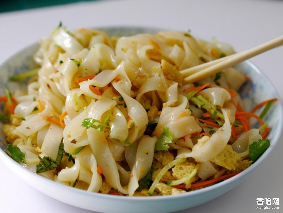 將綠豆、高粱、豌豆、山芋等加工成淀粉(可混合用,也可單獨用),調(diào)成稀糊,用大鍋加水燒開,用器皿取淀粉50克左右,放入特制的銅鏇內(nèi)(形似平底鍋),將鏇子放入沸水上轉(zhuǎn)動,然后慢慢停止,淀粉糊在鏇子內(nèi)攤成薄薄的一層,然后鏇子內(nèi)放入沸水,迅速撈出放入涼水內(nèi),用手慢慢將薄淀粉皮從鏇子內(nèi)扒掉,放在特制的高粱稈或葦子做成的簾子上晾干即可。