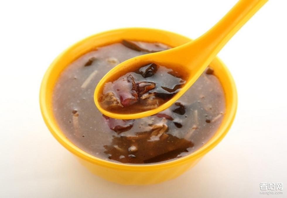 淮南胡辣湯,又叫油茶,淮南的油茶有很多的地方特色,裝的容器很有特色,是個巨大的鋁皮壺,有長長的壺嘴,用木塞塞住。吃的時候就倒一碗出來,稠稠的,不添加醬油的。里面加了面筋、千張絲、海帶絲、花生仁、黃豆、芝麻等,口味不一樣的賣家加的東西也會有所不同。喜歡辣的可自己加點辣,呼嚕嚕喝下去,非常過癮。但是注意,不能一直用調(diào)羹攪和它,不然會謝掉的,謝掉以后就像水一樣,就不好吃了。