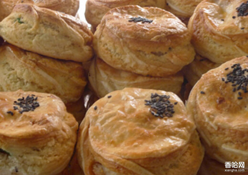 制作方法:1.將豬肥膘肉切成條,加鹽腌漬約3天,切成0.7厘米見方的?。惶疳u瓜切成??;京冬菜切細(xì)末;蝦米浸酒后切細(xì)末,加芝麻油拌勻;蔥切細(xì)末。把以上原料拌成餅餡。2.取面粉450克加熟豬油200克揉成油酥面,摘成25個(gè)劑子。3.把食堿燙酵面搓成條,摘成25個(gè)面劑。把油酥面劑放在燙酵面劑上,用手掌推成長(zhǎng)18厘米、寬12厘米的橢圓形,倒卷4層,按扁,兩頭折攏成12層,搓成直徑8厘米的圓形皮子,包入餅餡,搟成直徑為7厘米、厚1厘米的生坯燒餅。取飴糖20克加水15克攪勻,刷在餅面上,撒上芝麻,對(duì)面折成25對(duì)。4.燒餅爐用木炭生火,待爐溫升至200℃時(shí),塞住風(fēng)口,右手在生坯餅背面撣點(diǎn)水,交叉貼在爐壁上,貼完后啟開風(fēng)口,烘至餅呈淡黃色時(shí),封住爐口及風(fēng)口,再燜烘約5分鐘出爐。