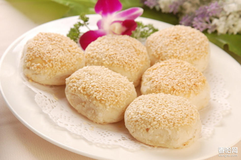 清真油麻餅,原為清末鹽城回民哈云書開辦的“哈鹿鳴”清真菜館創(chuàng)制,今清真飯店仍保持這一特色。制法是將糯米粉、面粉按一定比例拌和,包入桂花糖、金桔等精制而成的餡心,放入熱油煎之。制作工藝考究,制成后外脆、中粘、心甜。食用時(shí)逐層品嘗,清爽可口,齒舌留香。