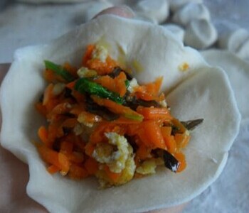 4、將炒好的胡蘿卜放入雞蛋丁和木耳中,加入適量的青菜末、鹽、五香粉拌勻,這個(gè)餡就調(diào)好了。