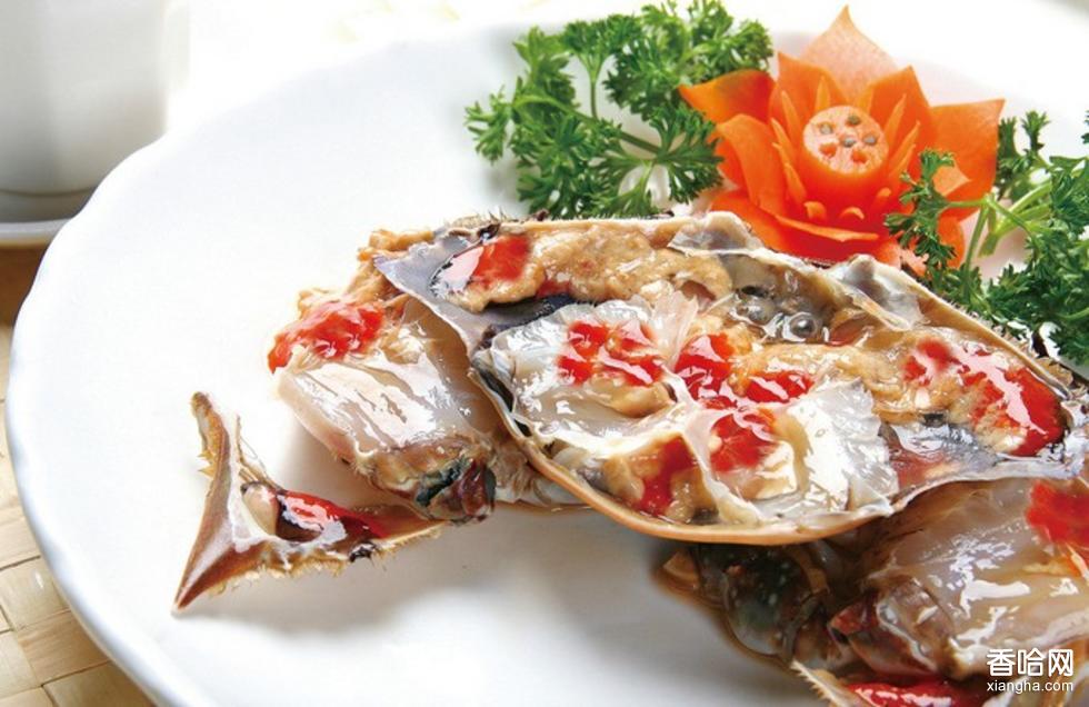 紅膏熗蟹是浙江寧波傳統(tǒng)的漢族小吃,色彩艷紅、鮮咸滑嫩。在盛器中放入冷開(kāi)水,加鹽、白酒、蔥、姜,調(diào)成濃咸鹵,再將洗凈后的紅膏蟹放入,浸腌8小時(shí)后即可。紅膏咸槍蟹都是東海里的野生梭子蟹做的,個(gè)頭壯實(shí),有紅膏,蟹背殼上有小孔,可以看到紅膏,肉質(zhì)飽滿(mǎn)。