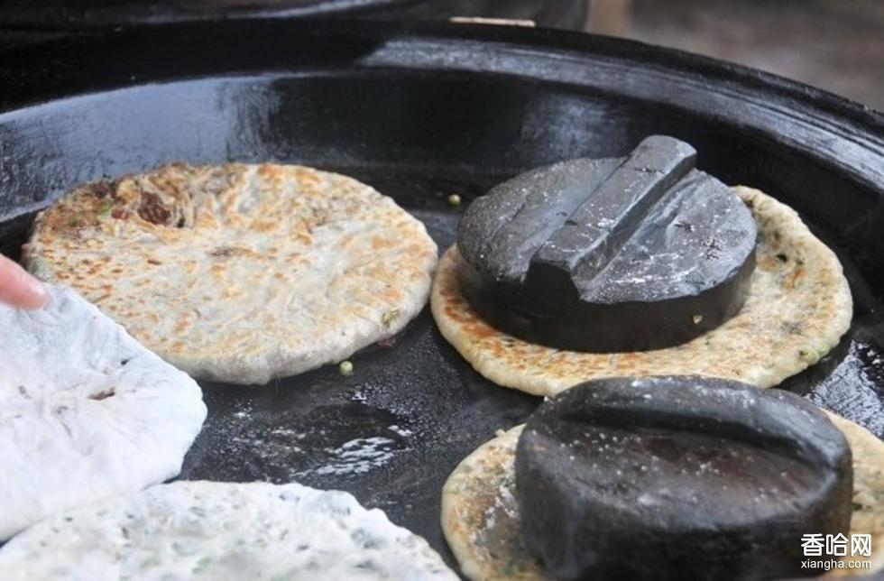 古城歙縣的街頭食攤,可以見到一種平底鍋里放著一種扁平的面馃,上面壓著一塊油光滑亮的黑石頭,面馃發(fā)出“嗤嗤嗤”冒油響聲,噴發(fā)出襲人的異香,行人見了此種馃子,往往駐足攤頭,等候品嘗其味。