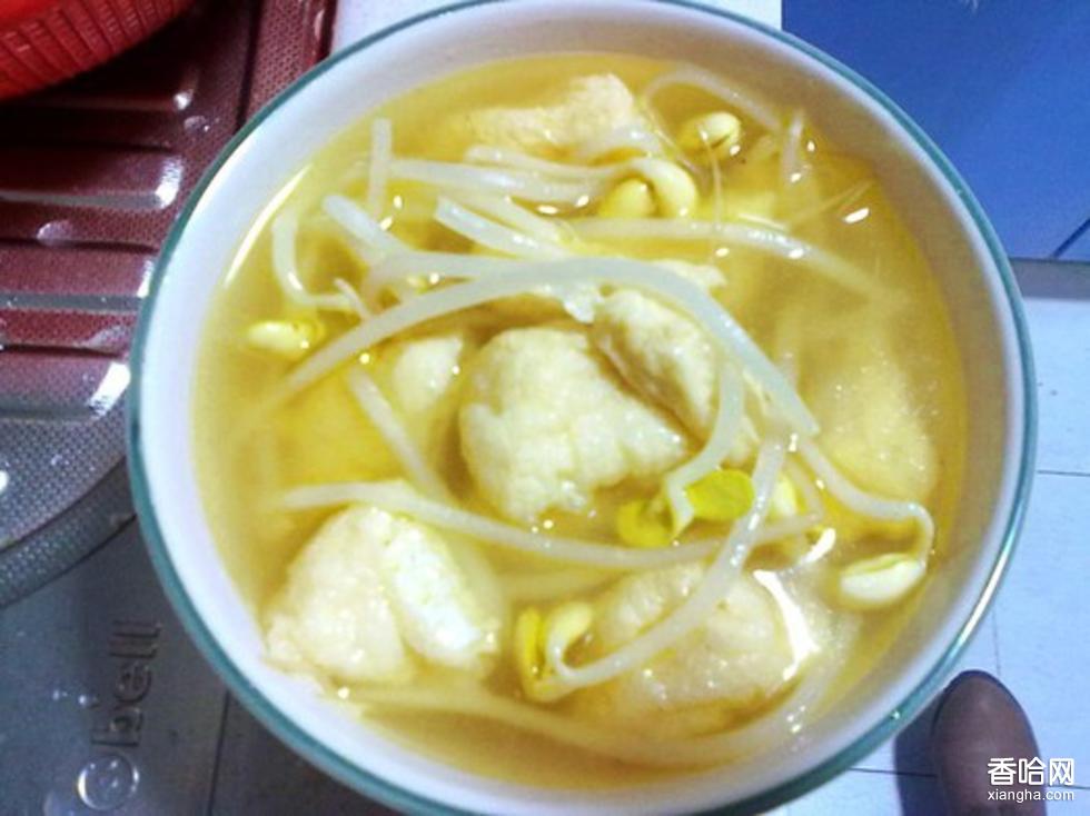2.黃豆芽過開水焯燙撈出,與木耳、豆腐果一起放入骨頭湯中,煮制幾分鐘,加鹽、味精出鍋,放入胡蘿卜片即可。