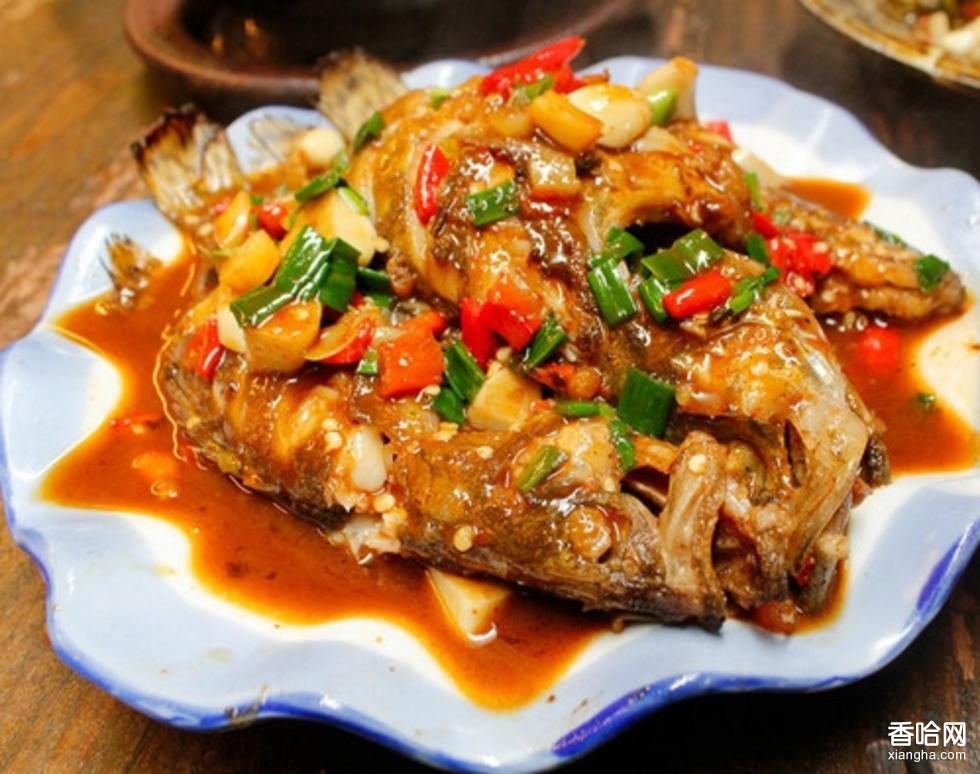 先將大馬哈魚打上花刀,用醬油先鹵,再入鍋油炸。鍋內(nèi)留底油,用蔥、姜炸鍋,下肉丁、豆瓣醬煸炒,添清湯、醋、精鹽、味精、白糖、辣椒面和炸好的大馬哈魚,用文火煨燉。待汁味漬入魚內(nèi),淋入香油,撒上香菜段即成。