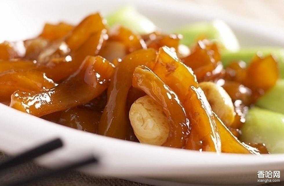 松仁燒鹿筋,用梅花鹿筋,大興安嶺的松仁、蔥、姜、青椒、洋蔥。做法:將鹿筋浸泡四個(gè)小時(shí)以上;油燒熱后加入蔥、姜爆香后加入鹿筋;鹿筋變軟放入青椒、洋蔥及松仁;勾芡,起鍋。特點(diǎn):顏色紅潤(rùn),鹿筋軟嫩,有強(qiáng)筋壯骨的功效。
