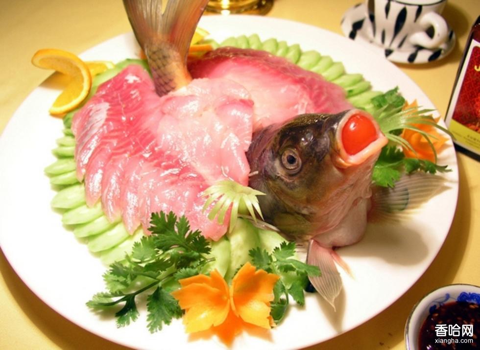 (1)把活魚(yú)肉削下,切成薄片,放到盆里上桌。