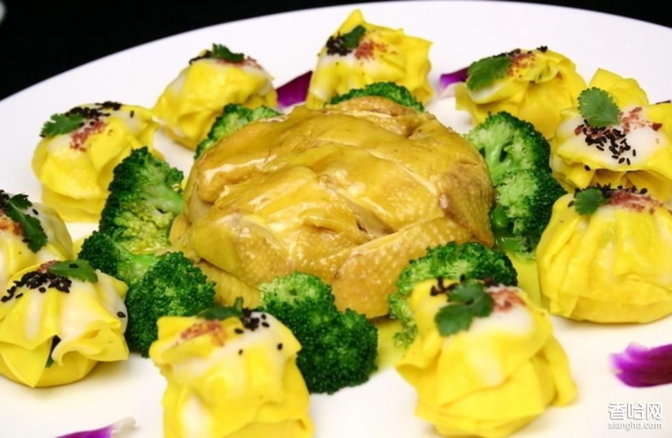 19.取雞,胸脯朝上撈入大湯盤中,蛋燒賣轉(zhuǎn)圍放在雞的周圍;