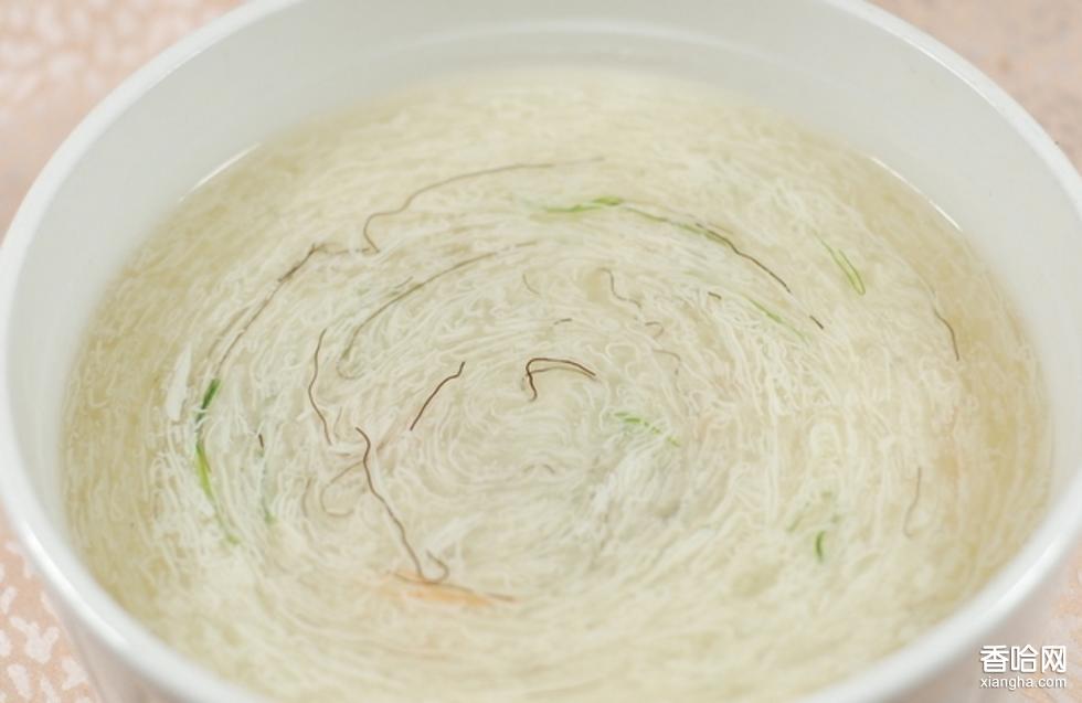 9. 另取鍋置火上,舀入雞清湯500毫升,沸后投入豆腐絲,待豆腐絲浮上湯面,即用漏勺撈起盛入湯碗內(nèi)上桌。