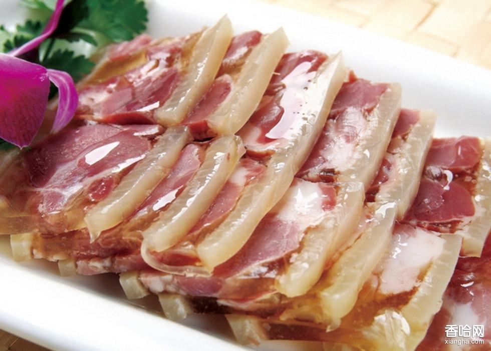 水晶肴蹄,又名水晶肴肉,是江蘇鎮(zhèn)江區(qū)漢族傳統(tǒng)名菜,屬于蘇菜系,迄今已有300多年的歷史。水晶肴蹄成菜后肉紅皮白,光滑晶瑩,鹵凍透明,猶如水晶,故有“水晶”之美稱。食用時,具有瘦肉香酥、肥肉不膩、酥香嫩鮮等特點,佐以姜絲和鎮(zhèn)江香醋,更是別有一番風(fēng)味。有詩贊曰:“風(fēng)光無限數(shù)今朝,更愛京口肉食燒,不膩微酥香味溢,嫣紅嫩凍水晶肴?!?/p>