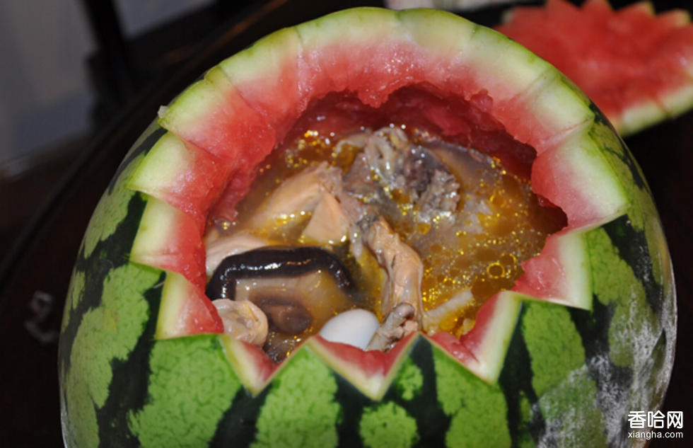 西瓜用于制菜始于清宮。西瓜雞是孔府內(nèi)廚首創(chuàng),又名"一卵孵雙鳳"。此菜用西瓜和雛雞加干貝、口蘑等配料烹制而成。據(jù)說(shuō)孔府曾用此菜宴請(qǐng)清帝王、進(jìn)貢慈禧太后。清朝末期,該菜傳入江蘇各地,成為人人喜愛(ài)的夏令名吃。