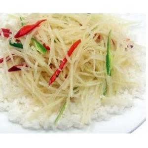 2、洗干凈鍋,倒入食油燒熱(大概30溫高),下蔥花、蒜茸、干辣椒絲大火爆香,然后放入肉絲燒至脫血,再放入尖椒絲略炒,再放入土豆絲,看見土豆絲軟了,加少許鹽、雞精炒勻,淋米醋、花椒油,出鍋。