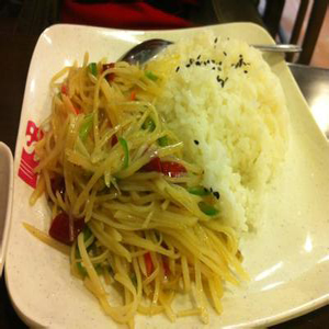 一份青椒炒土豆絲蓋燒飯,解決你的一餐,簡單但足以為你提供一天的能量。