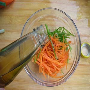 3、熱油,下胡蘿卜絲炒軟;