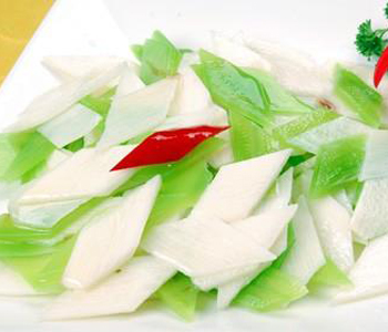 萵筍的學名叫“莖用萵苣”,俗稱有萵筍、青筍、生筍等,為菊科萵苣屬植物。良質(zhì)萵筍——色澤鮮嫩,莖長而不斷,粗大均勻,莖皮光滑不開裂,皮薄汁多,纖維少,無苦味及其他不良異味,無老根、無黃葉、無病蟲害、不糠心、不空心。次質(zhì)萵筍——葉萎蔫松軟,有枯黃葉,莖皮厚,纖維多,帶老根,有泥土。劣質(zhì)萵筍——莖細小,有開裂或損傷折斷現(xiàn)象,糠心或空心,纖維老化粗硬。
