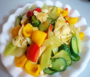 材料:萵筍、黃瓜、黃椒、紅椒、雞蛋、蔥、姜、蒜、花生油、鹽、