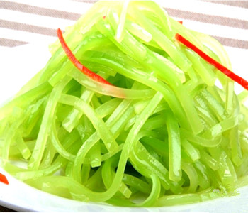 1、萵筍去掉葉子,削去外皮,洗凈后切成絲(有工具的朋友也可以直接擦成絲);