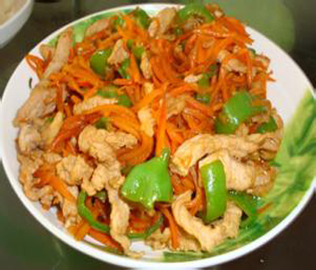 青椒胡蘿卜炒肉絲是一道家常菜,也算是美味的菜肴,其肉質(zhì)鮮嫩,胡蘿卜清脆爽口。辣椒帶來的一點(diǎn)微辣,提高了這道菜肴的芬香,人們吃起來將變得更有食欲。