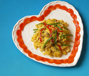 材料:青紅椒各半個、雞蛋三個、蔥10克、鹽少少許、油一湯匙
