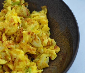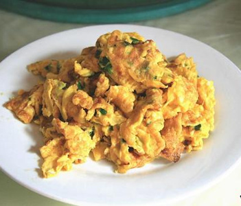 3、接著打雞蛋入鍋,迅速用炒鏟快翻,將雞蛋炒碎,見熟色即出鍋。